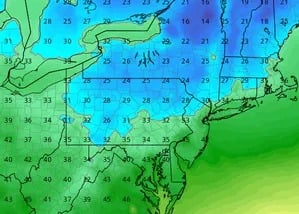 The weather pattern this month still shows several shots of very cold weather heading our way during mid-month which could impact fruit tree blossoms. The image to the right are the low temperatures predicted for morning of April 18th.