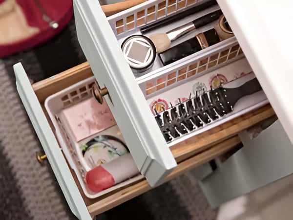 Instead of having a junk drawer where items accumulate, use small baskets or dividers in your drawers to make sure that everything has a home—and stays there. Even a standard cutlery divider makes a great storage solution for makeup and other beauty products.