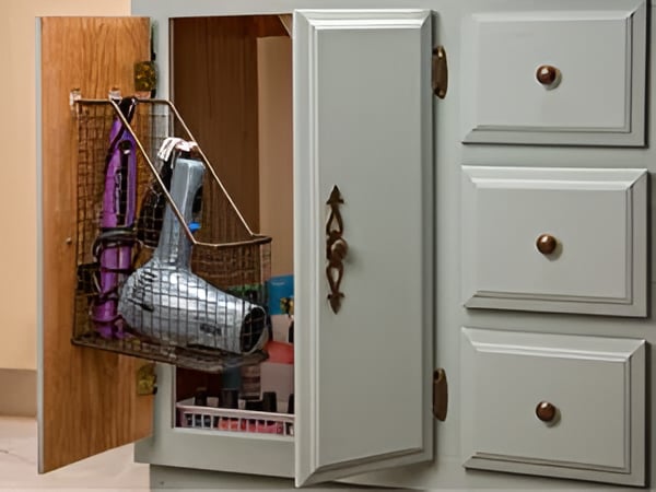 No place to house your curling iron and blow dryer? Hang a file box on the inside of your lower cabinet door for an ingenious space to hold your hair tools. This trick not only keeps tools out of sight but also keeps them easily accessible and organized.